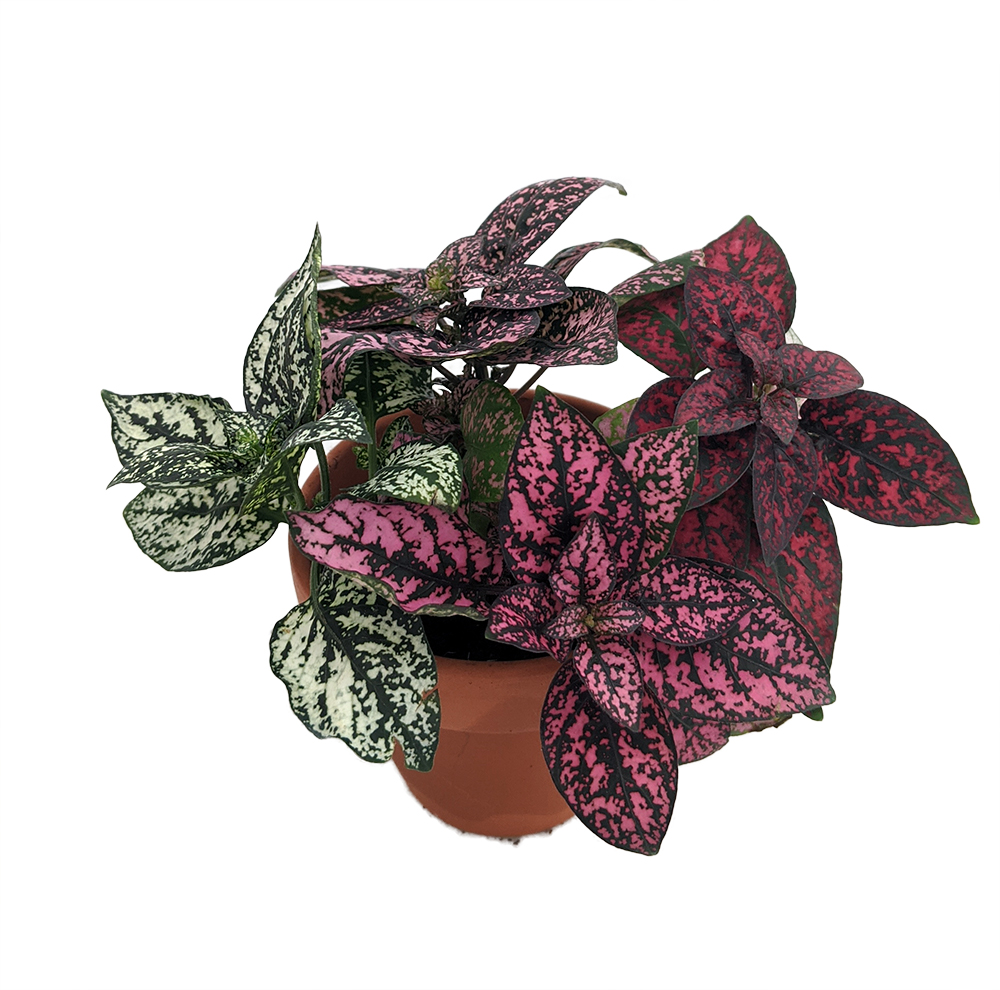 As its common name of Polka Dot plant suggests, this plant has spotted leaves. It grows rapidly, usually becoming 6 to 12 inches tall and sometimes equally wide, though it may become as much as 2 feet tall. The 1 1/2 to 2 1/2 inch leaves are hairy and densely set. You will receive 3 different varieties in the pot. The exact varieties may vary with the season.