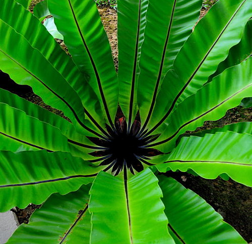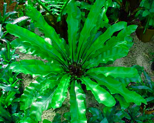 Asplenium nidus , or Japanese Bird's-Nest Fern, is native to Tropical Asia. It is a spectacular, epiphytic fern with apple green fronds that will reach up to 20-60 inches (50-150 cm) long by 8 inches (20 cm) wide. As the fronds age, they have a prominent blackish midrib. They make outstanding house plants and are very showy. Culture: Asplenium nidus does best with bright, indirect light. The plants should be kept moist at all times, especially during the growing season. Water should be somewhat restricted in the winter, but the plants should never dry out completely.