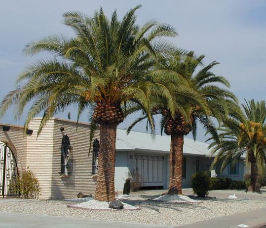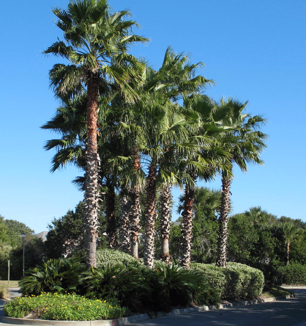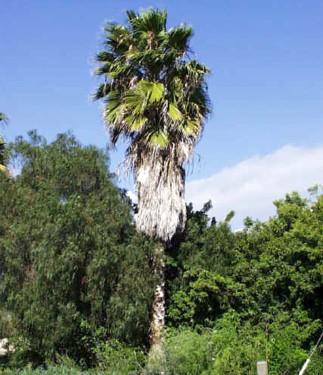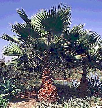 Washington Palm: Soaring to over 100', this skyscraper of the palm world is a striking sight when planted at equal intervals along a boulevard or when snuggled up in groups against high rise buildings. The gray trunk is ringed with closely set leaf scars although usually at least part of the trunk remains covered with old leaf stem "boots." The solitary trunk bulges at the ground and becomes slender as it approaches a crown of large palmate leaves with gracefully drooping tips. These are glossy rich green and grow to about 5' long and 4' wide and are borne on 3' orange stems that are edged with saw-tooth spines. As the leaves die, they fall against the trunk to create the "hula skirt" effect for which this palm is famous. In early summer large branched inflorescences extend past the leaves and bear bunches of small whitish flowers. These mature into 1/2" black berries that are easy (for a palm) to germinate. This palm is native to the desert mountain valleys and canyons of Sonora and Baja Mexico. It is a popular landscape plant in Florida, California and Arizona and in areas where it is hardy throughout the world. Washington palm prefers a moderately rich well-drained soil but can survive on poor soils, even sand. It does best in bright sunny conditions but Washington palm will tolerate some shade. Moisture: Washington palm is very drought resistant when established, but looks better and grows faster when given adequate moisture.