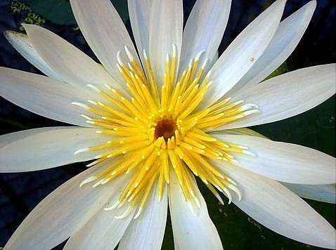 The flowers are emersed, 7-18 cm in diameter, opening and closing diurnally, with only the sepals and outermost petals in a distinct whorl of 4. The sepals are green, flecked with short dark streaks and faintly veined. There are between 12-21 pointy white petals per flower, with 50-190 yellow stamens positioned around a 3 mm central yellow disk. The seeds are nearly globose to ellipsoid, with longitudinal rows of hair-like papillae. The Nymphaea Ampla blooms all year round in hot climate.