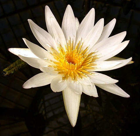 The large, elegant fragrant white flowers are held well above the water at the tip of a sturdy green stalk and appear almost constantly from spring until the end of summer. They are bisexual, star-like and regular with 4 sepals, green on the outside with many white petals. This is one of the most generously blooming water lilies, and frequently has as many as a half a dozen flowers open on a single day.