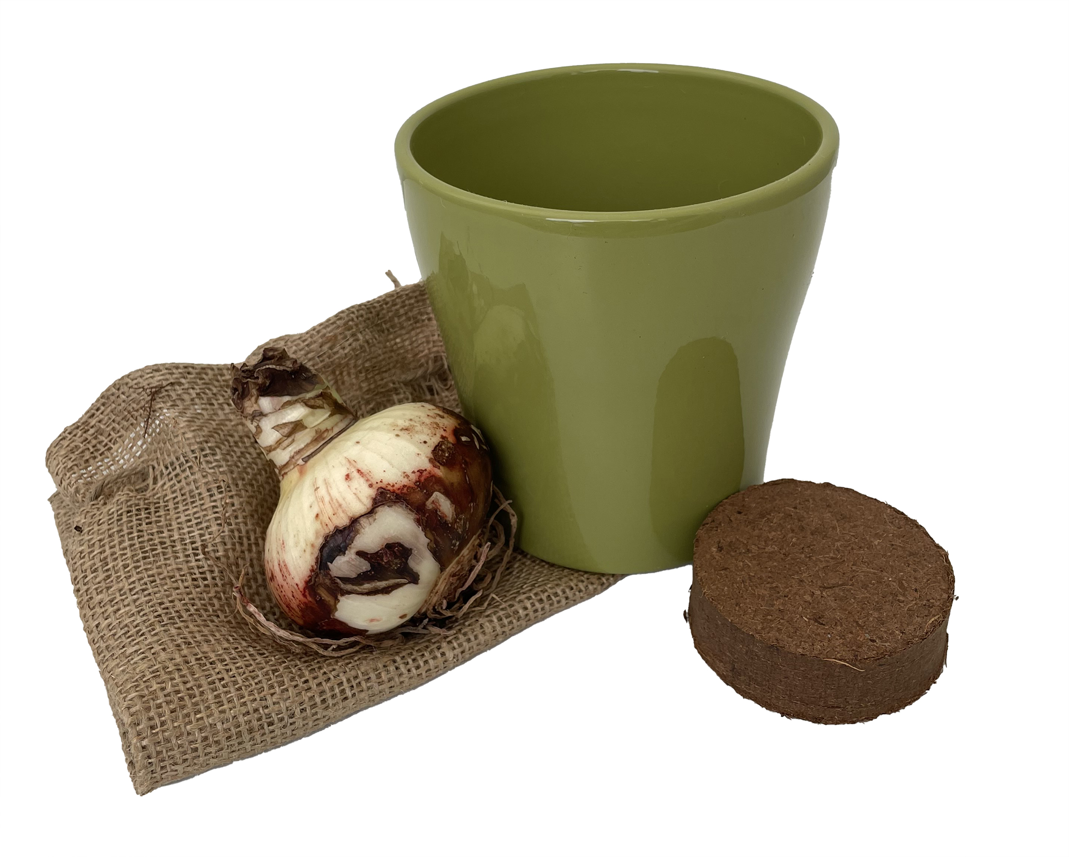 Kit includes: Green ceramic pot, growing medium, large bulb, planting and growing instructions