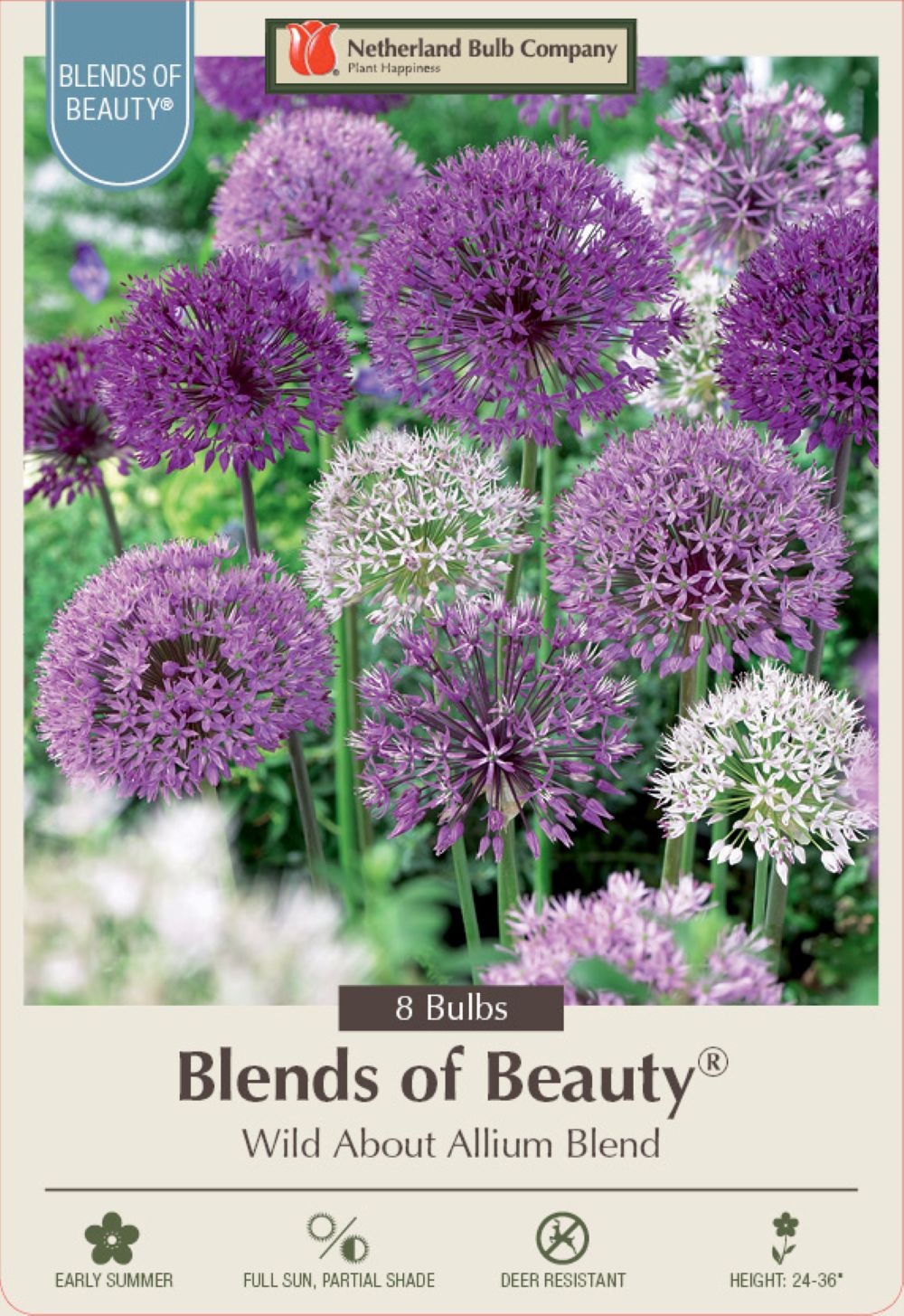 This new mixture creates a stunning combination for you. The classic purple allium globes mixed with white. The flowers bloom at 24 to 36", and the globes are between 4 and 6" in diameter.