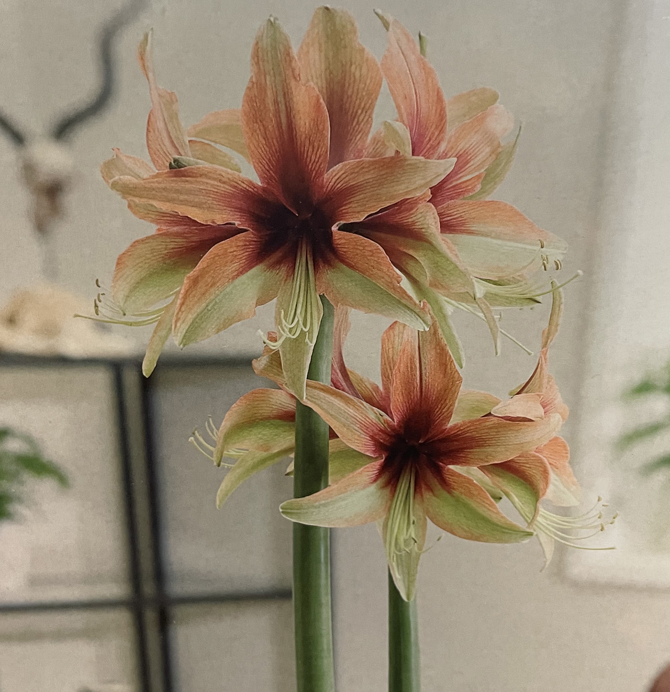 Amaryllis Wild Amazon - Single flowers with six slender, pointed petals sit atop stems like glowing stars. Soft tangerine hues on upper petals are complemented by hints of citrus green on lower petals. Throats are painted in deep cinnamon to form an inner star.