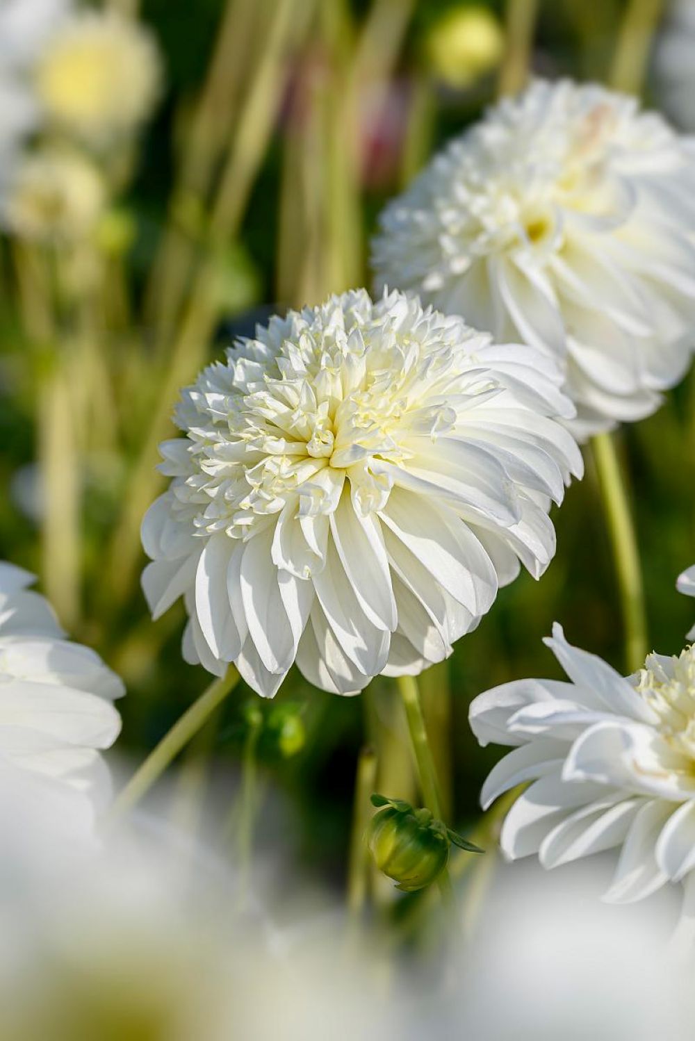 Dahlia 'Zahra' is an anemone-flowered variety with bright, eye-catching bloom. Its creamy white center is surrounded by flat, pure white petals. This striking dahlia reaches a height of 30 inches/80cm, making it a standout in any garden. Blooming from summer to autumn, it thrives in full sunlight and well-drained soil.